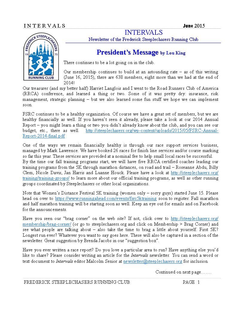 • Frederick Steeplechasers Running Club Celebrates 50 Years