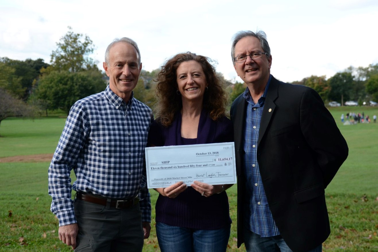 Frederick Steeplechasers Running Club President Jill Cameron and Race Director Lou King presented the check to SHIP Executive Director Ed Hinde last week.