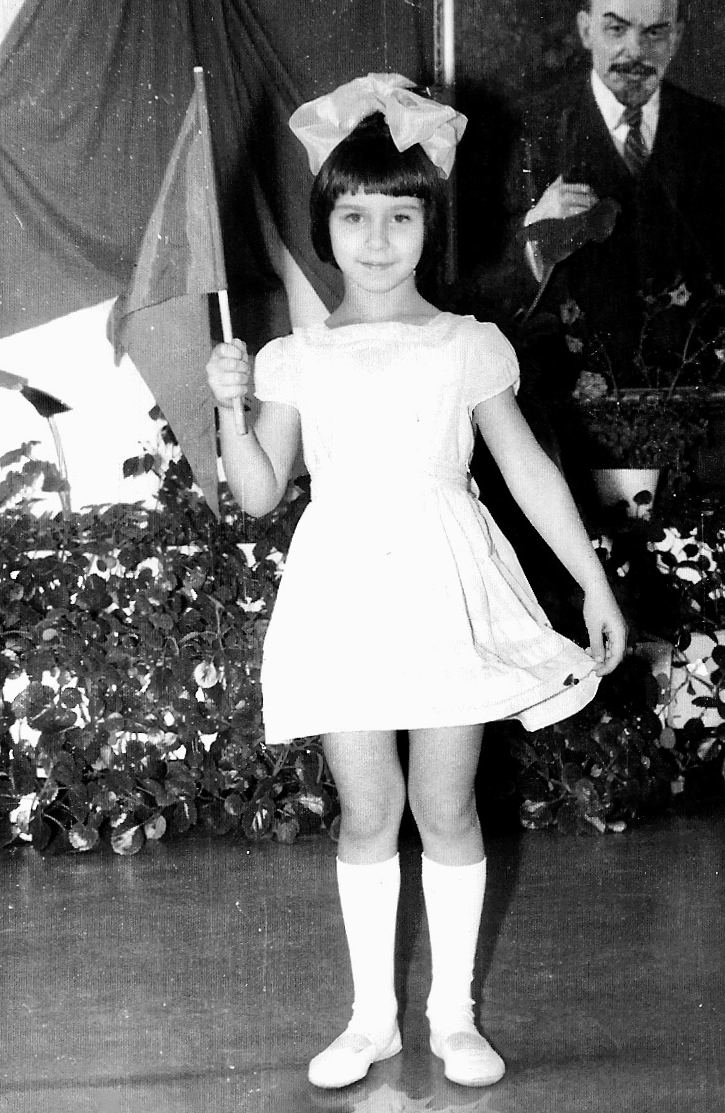 Oksana at age 6 and the then omnipresent Vladimir Ilyich Lenin, who “lived forever” on the wall of every Pre-K, school, university, and in any professional working environment, constantly watching over his communist flock.