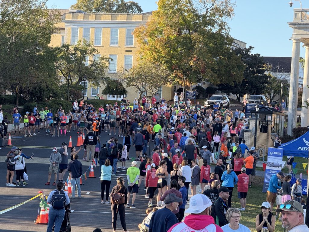 Race day dawned, and I made the foggy trek out to Shepherdstown and the start line. The morning was cool enough that I had a light jacket on, which was quickly tied around my waist before the run began. The marathon had started before I had arrived, but I was able to cheer on the half marathoners!