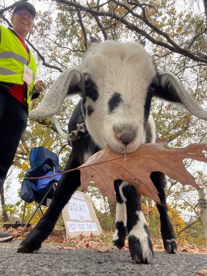 A real goat, calmly chewing leaves, stationed near a sign that read: You may not be the GOAT, but you got this!