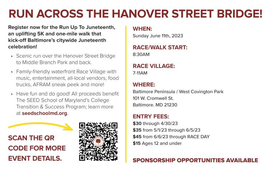 The first annual Run Up To Juneteenth 5K Run/1mi Walk was held in 2022 at the Baltimore Peninsula, and we’re back for 2023! We are Baltimore City’s official kickoff to the AFRAM Juneteenth celebration. Our 5K route begins in West Covington Park and spans the iconic Hanover Street Bridge, with a loop around Middle Branch Park that offers incredible views of the middle branch of the Patapsco River. As the first and only race route sanctioned to run across the Hanover Street Bridge connecting Baltimore Peninsula with the Cherry Hill neighborhood, the Run Up To Juneteenth is poised to become a Baltimore favorite. Take a look at our 2022 Sizzle Reel. Sign up via our Registration Link today!